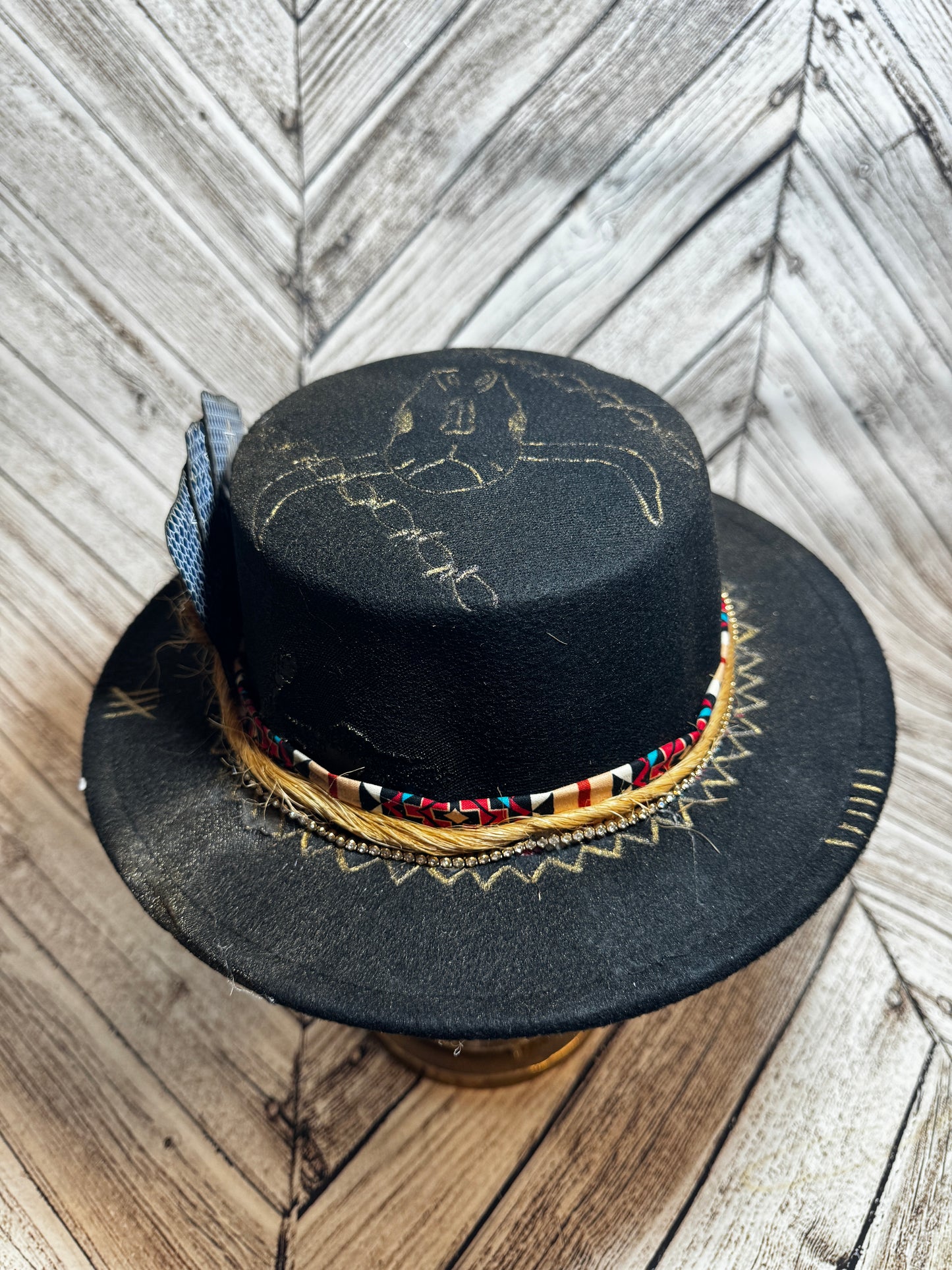 Custom felt hat with a good bull head burnt ace king and queen. Rhinestones Aztec and twine